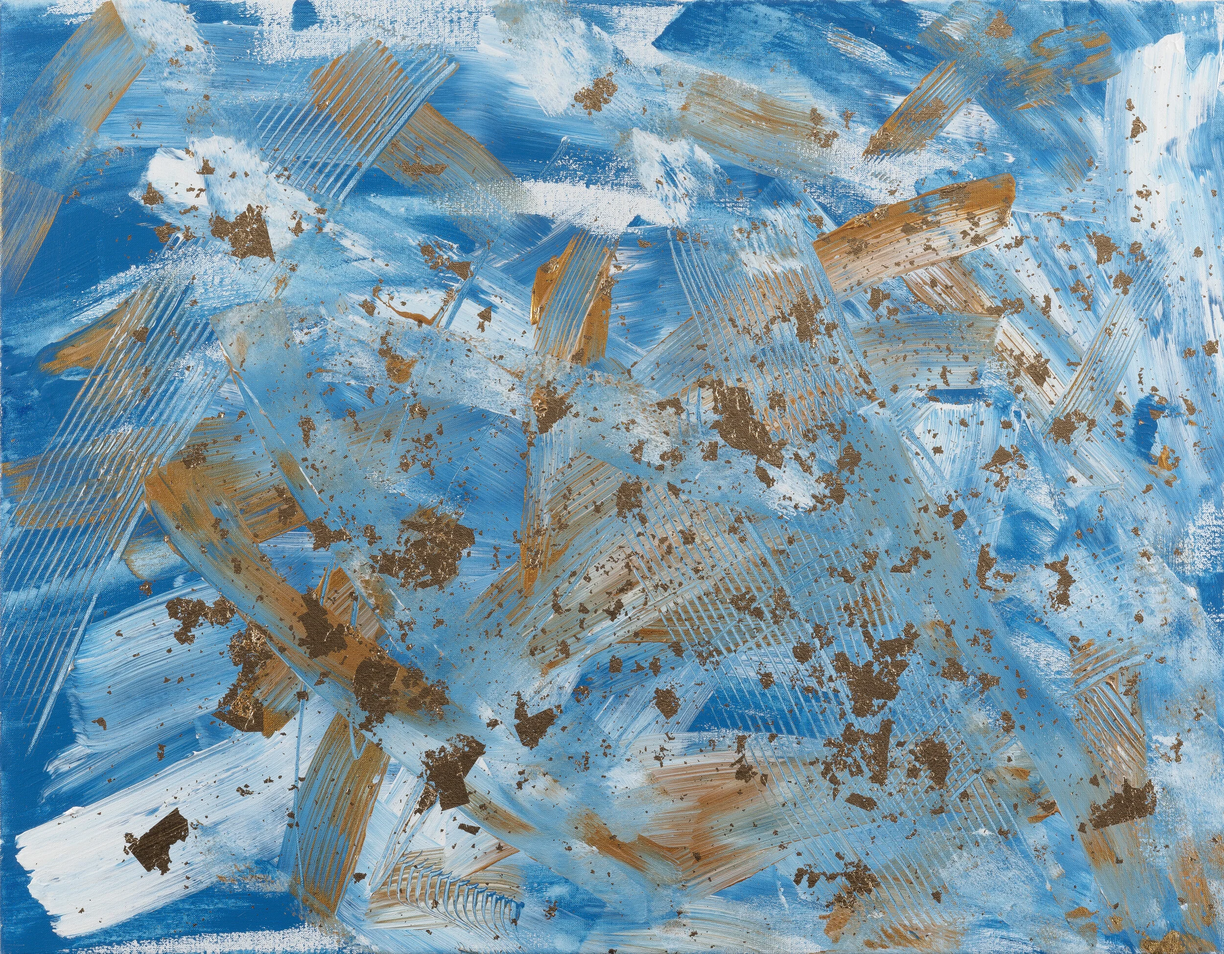 Boisterous strokes in ecstatic harmony combine, informing an outburst of raw, unfiltered glee; every inch covered by Lobert’s joyful engagement. Perhaps this ode to the United Arab Emirates contains the vast aquamarine sea, its periphery dotted by gilded architecture glinting with sparks of white light; or an azure sky flummoxed by a summer sandstorm. The artist’s use of the end of a thin paintbrush to randomly scratch the surface seems to carve her own space as her choice of gold leaf and gold paint accentuates a luxurious testament.